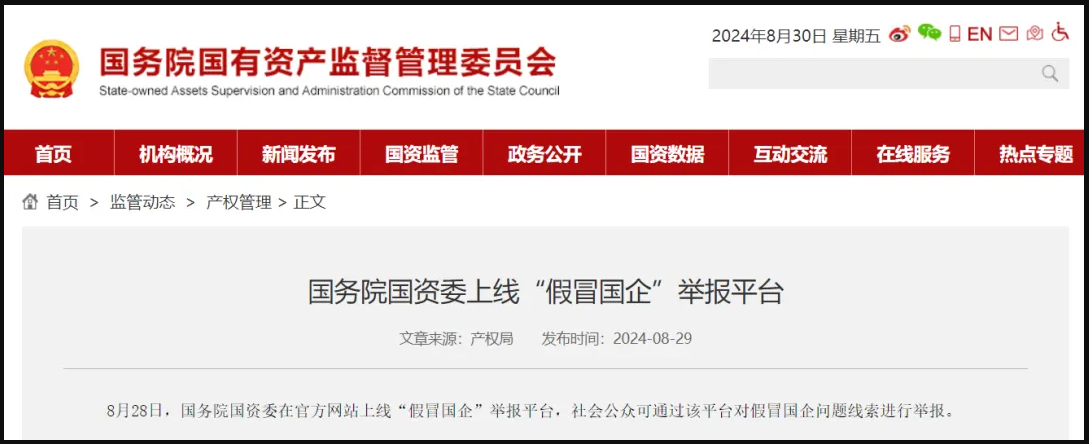 8月28日,国务院国资委在官方网站上线“假冒国企”举报平台,社会公众可通过该平台对假冒国企问题线索进行举报。