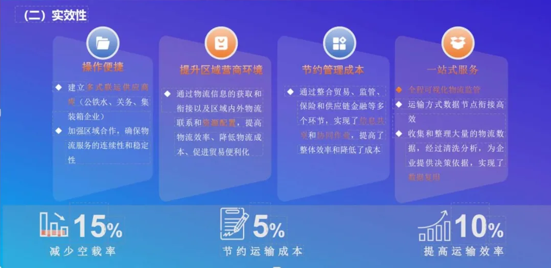 平台是以多式联运及一单制为基础,以物贸融一体化发展,通过与国家机构、政府监管部门、物流运输企业的数据互通,形成集物流产业贸易、公铁水空数据共享交换、智能数据分析为核心的川陕甘地区物流行业一站式综合型智慧物流信息平台,推动物流提质降本增效。