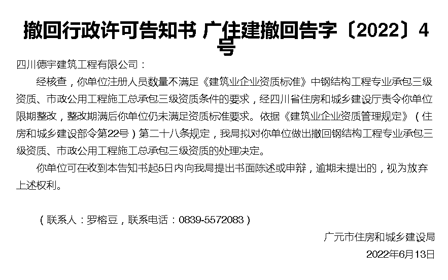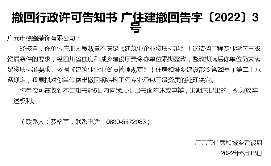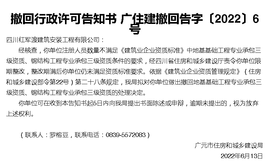 注册人员数量不满足《建筑业企业资质标准》,撤回行政许可告知书